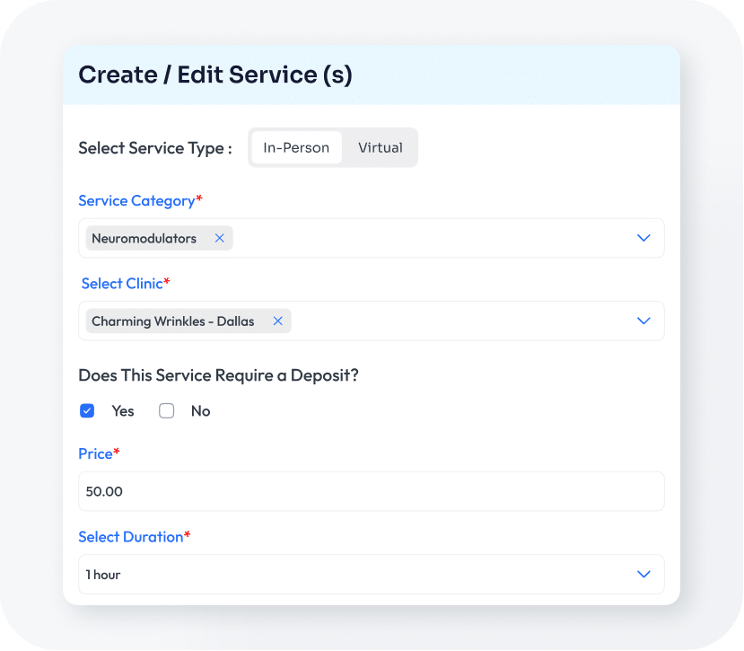 Set custom deposit amounts by service. Once a patient pays at the time of booking, the deposit is stored in the Patient Wallet until treatment.