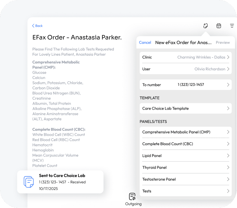 Aesthetic Record’s HIPAA-Compliant eFax Integration is your built-in solution for safely sending and receiving eFaxes directly inside your EMR to labs, pharmacies, or other medical offices. This eliminates paper, reduces risks, and ensuring every critical document is instantly filed to the patient’s chart. Modernize your workflow to support the complex needs of your practice.