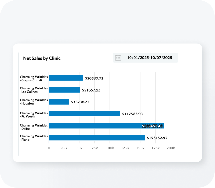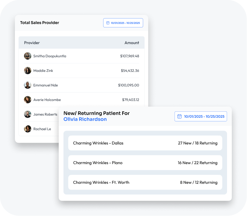 Gain a 360-degree view of every team member’s contribution. Measure productivity using a range of key metrics, including Average Sales, Booked Appointment Percentages, Patient Satisfaction Scores, and Patient Retention. This data, centralized in Business Insights, gives you the actionable data points needed for targeted coaching and development.