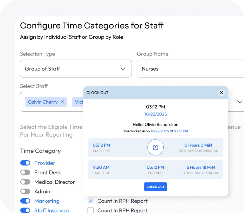 Ensure accurate payroll and simplify clock-in with an integrated, easy-to-use time tracking system. Staff can clock in and out from the convenience of the Aesthetic Record Provider App or the web. This eliminates manual time sheets, and provides a clear audit trail for attendance and accurate logging of hours worked. You can leverage the time clock to categorize work roles and activities. This helps you track where each staff member is spending their time and measure key metrics like Revenue Per Hour based on actual revenue-producing time.