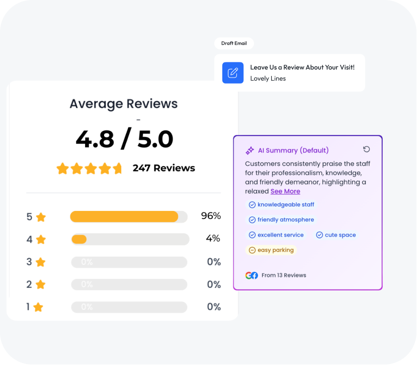 Target patients who haven’t booked in a while with win-back automations, referral requests, and review prompts. LeadAR makes it easy to stay visible and valuable long after the visit ends. Our AI-Powered Review Tools seamlessly integrate with Aesthetic Record to automatically request Google reviews the moment an appointment is complete, helping you manage your online reputation and drive new business.