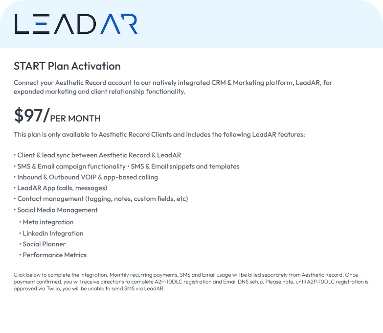 When it comes to marketing, a lot of EMR systems claim they have full CRM capabilities built into their software. At Aesthetic Record, we’re fully focused on building a best-in-class EMR and Practice Management system, so we leave the CRM functionality to software designed exclusively for that purpose. Enter LeadAR! With our native, fully integrated CRM, you can get the best of both worlds. Take advantage of the core CRM functionality like email and SMS campaigns, social media integration, The my LeadAR app and in-app calling when you activate the Start Plan.