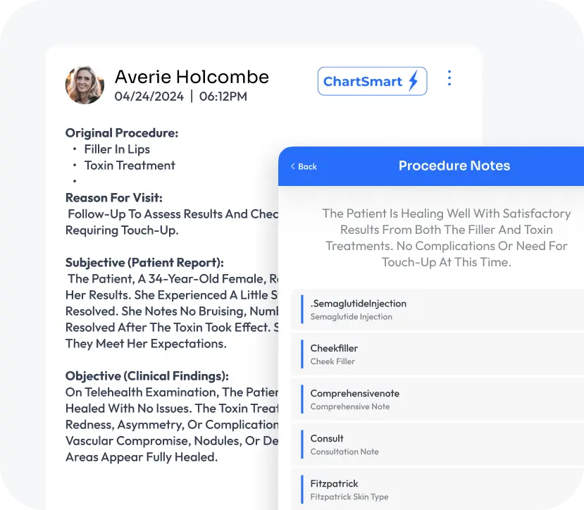 ChartSmart, the only AI-powered charting tool built for aesthetics, transforms your telehealth transcript into an accurate, compliant encounter note. Choose from existing aesthetic-focused templates or create your own unique prompt.