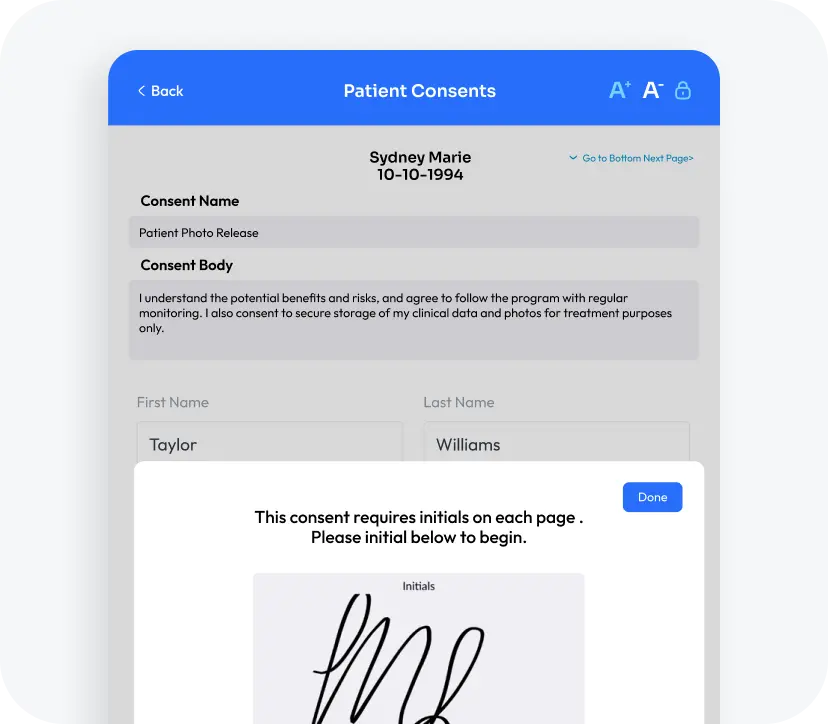 Patients complete intake forms, digitally complete questionnaires and sign consents, and process payments before their virtual appointment begins. From scheduling to follow-up, every part of the patient journey remains centralized and convenient in hte AR who are not physically inside of your treatment room.