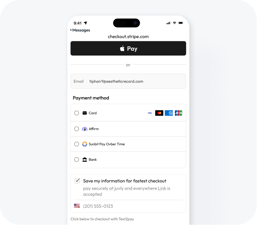 Text2Pay goes beyond credit cards. Patients can securely transact with instant bank payments, Buy Now, Pay Later options like Affirm, Sunbit or Klarna, or they can use Apple Pay. Every payment method is secure and frictionless with no additional staff time required.