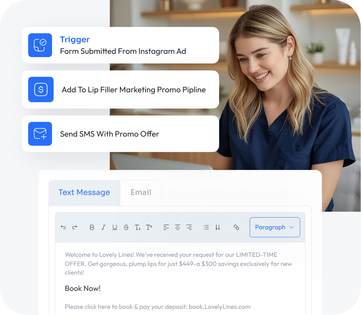Grow your aesthetic practice with our fully integrated, all-in-one CRM, sales, and marketing automation platform that simplifies lead generation and strengthens patient loyalty. Through powerful, AI-driven tools and automations, your practice will stand out in a competitive aesthetic market.