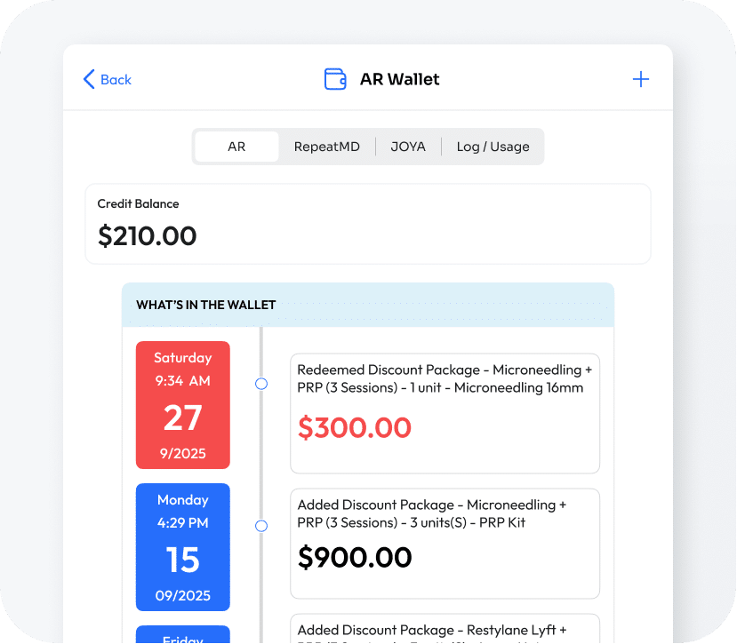 Patients can load funds, redeem gift cards, or apply credits for future services — all directly inside their profile. Whether it’s a membership payment, a package deposit, or a refund converted to credit, the Wallet makes it effortless to track and apply funds with accuracy every time.