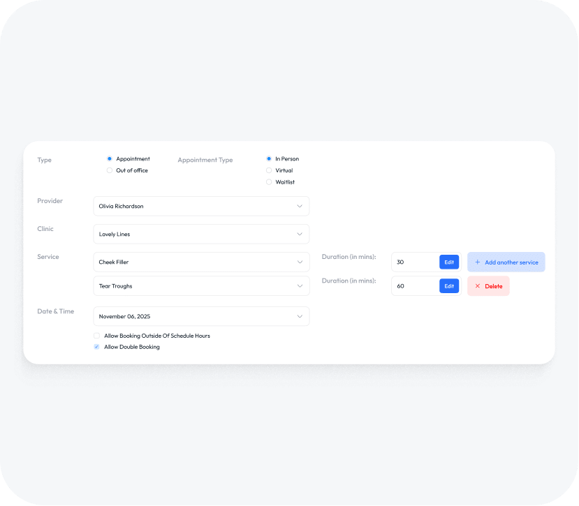 Aesthetic Record’s Smart Scheduling is the brain behind your calendar, ensuring every minute of your day is profitable. You set the rules—hours, equipment, and provider availability—and our intelligent system handles the rest, eliminating incorrect bookings and maximizing resource utilization.