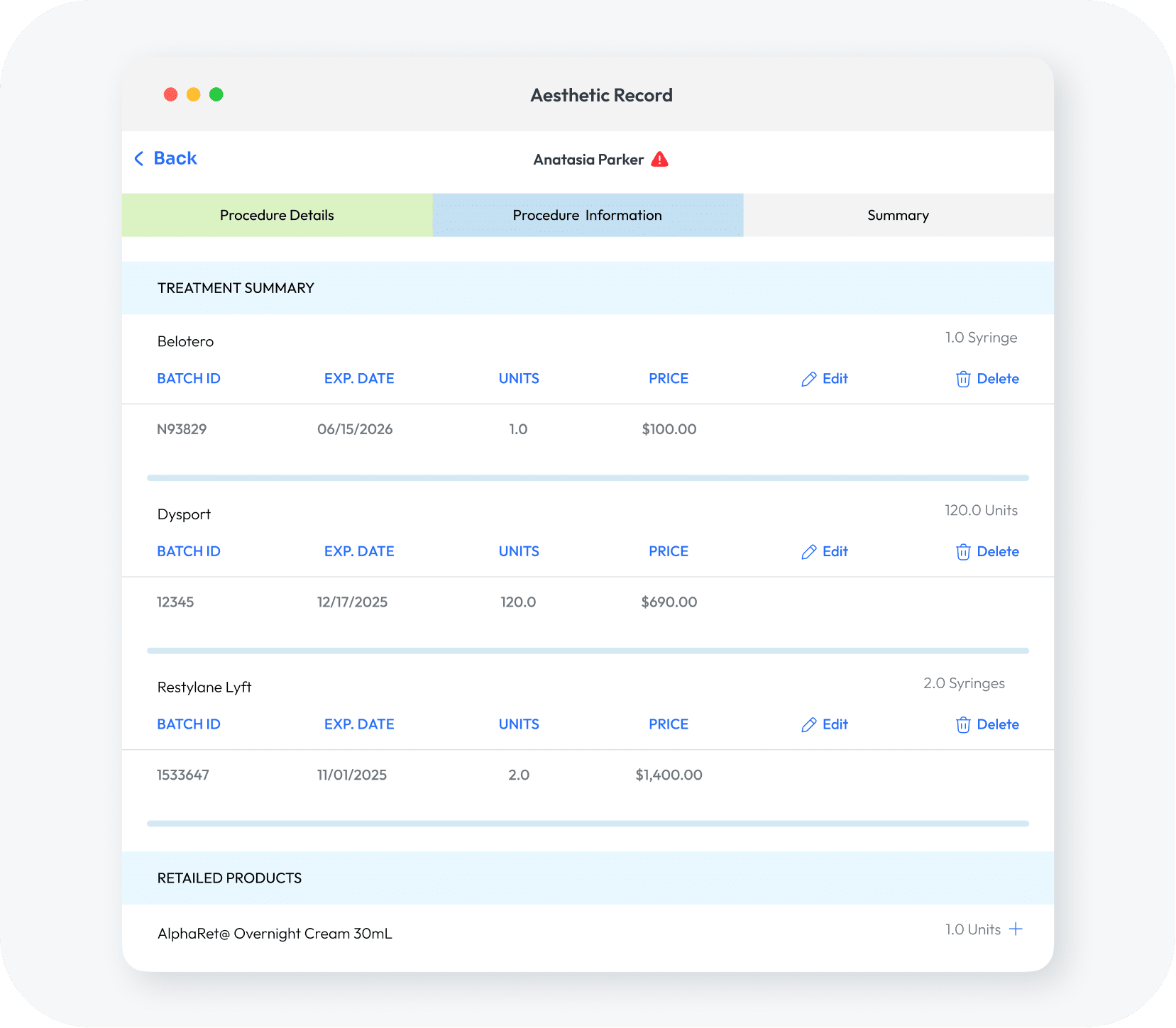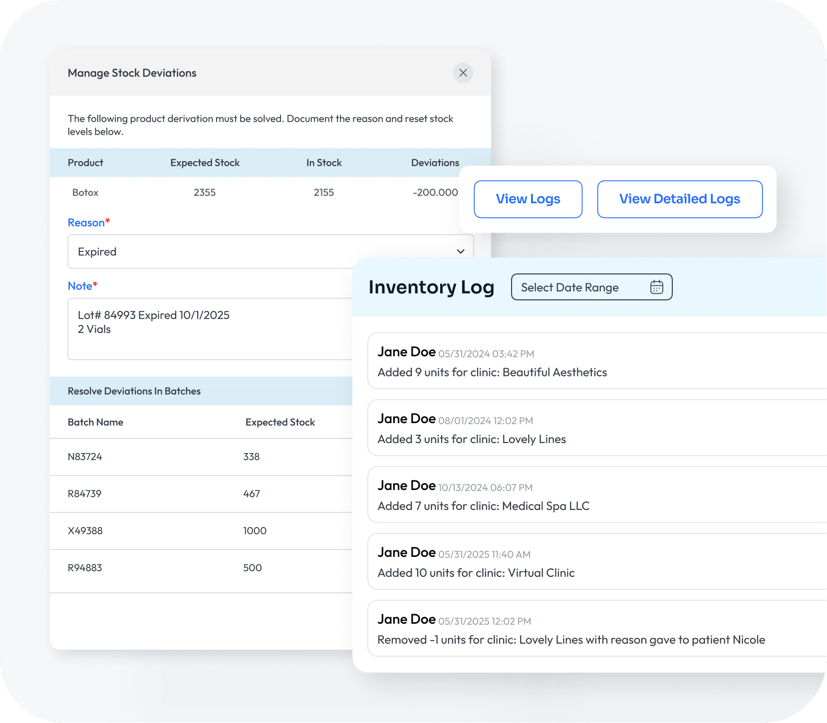 Every syringe, unit, or SKU entry contains a lot number, vendor, and expiration date so you know the status of what’s on the shelf.