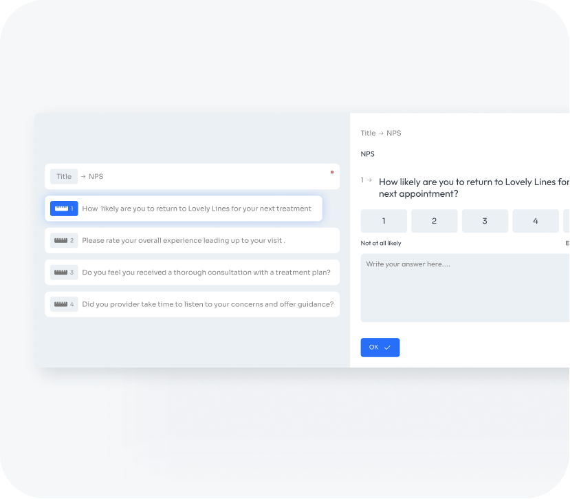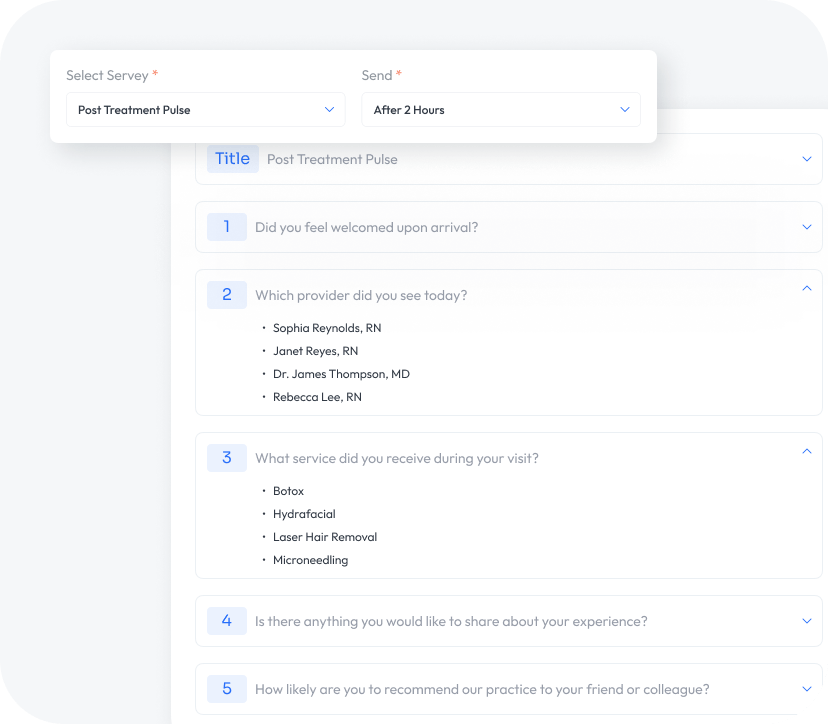 Create surveys with various goals and different post treatment time frames based on the service. Once you configure the survey and send times, they’ll be sent automatically following your schedule.