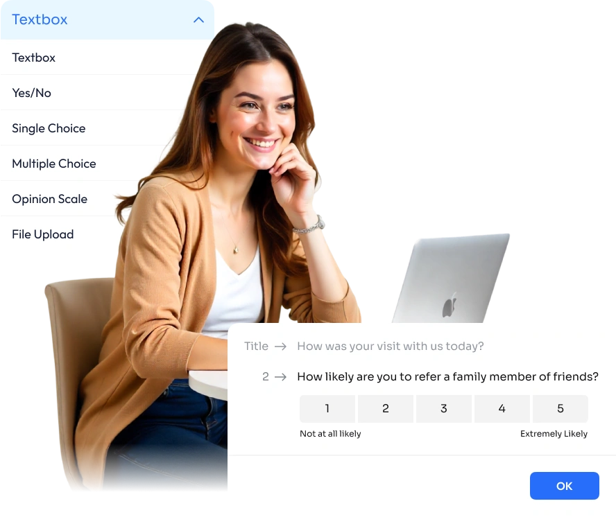 Tailor questions to specific services or providers or ask about the overall experience with your practice to measure key touch points throughout the patient journey .